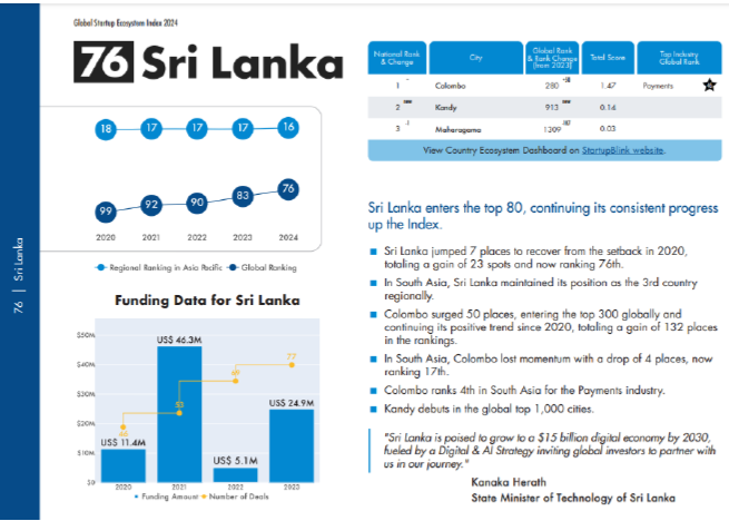 Sri Lanka ranks 76 on StartupBlink’s Startup Ecosystem Report 2024.